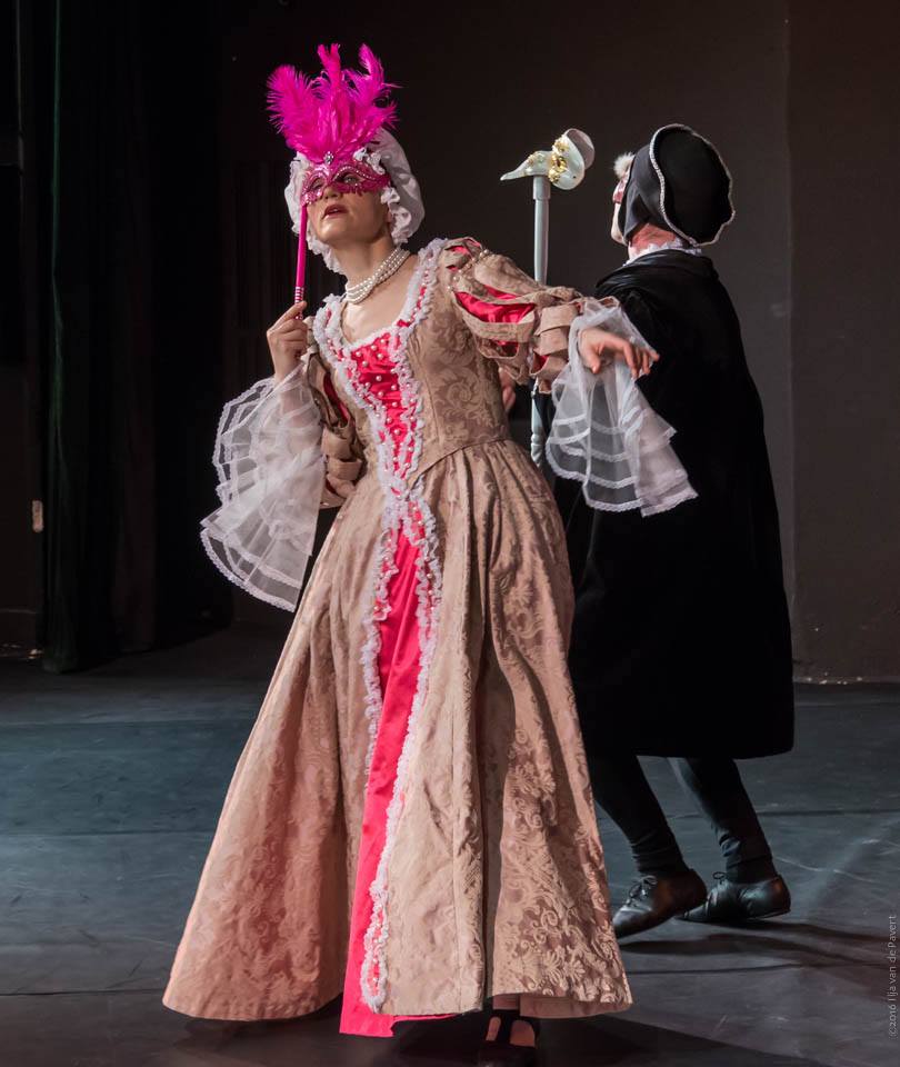 Sprytna pokojówka Kolombina pragnie poślubić swego pana. Sama zaś jest obiektem westchnień kupca Pantalone oraz służących: Arlekina i Brighelli. Ten drugi, zupełnie wbrew własnej woli,jest kochany przez poczciwą służkę Tognę, która marzy o jego wzajemności. Beatrice, młoda żona Pantalone, znudzona skąpstwem męża, liczy na znalezienie bogatego kochanka. Każdy ma nadzieję na spełnienie swych pragnień, ale gdy na balu wszyscy zakryją swą tożsamość pod maskami, sprawy przybiorą nieoczekiwany obrót. Kogo fortuna wyniesie wysoko, a komu da los żebraczy, przekona się ten, kto uważnie patrzy! Trupa KOMEDIANTY zaprasza na kolejną zabawę konwencją i formą, która wprawdzie korzeniami swymi sięga szesnastego wieku, ale jednak do dziś nie straciła na ostrzu humoru.