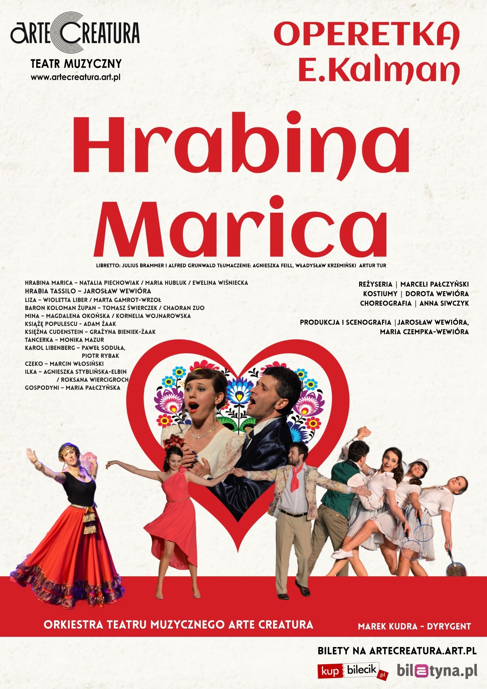 Na scenie wystąpią znakomici soliści międzynarodowych scen operowych z towarzyszeniem Orkiestry Teatru Muzycznego Arte Creatura pod dyrekcją utalentowanych dyrygentów. Daj się porwać namiętnym uczuciom głównych bohaterów, pełnej pasji i temperamentu muzyce, cudownym głosom i energetyzującym tańcom! Libretto opowiada historię pięknej i szalenie bogatej Hrabiny Maricy, która, nie mogąc opędzić się od adoratorów, publikuje w prasie informację o swoich zaręczynach z wymyślonym baronem Kolomanem Żupanem. Na nieszczęście, okazuje się, że taki baron faktycznie istnieje i przyjeżdża do posiadłości hrabiny na Węgrzech na własne zaręczyny. Do grona adoratorów Maricy dołącza też zubożały hrabia Tasillo, który jako zarządca zawiaduje jej majątkiem, by w ten sposób spłacić długi ojca i zabezpieczyć los siostry Lizy. Z kolei Żupan Koloman, by przejąć majątek po dziadku, może poślubić wyłącznie pannę bez posagu, całkiem „gołą”. Warunek ten spełnia właśnie urocza Liza. Niedoszły małżonek zwraca więc Hrabinie Maricy słowo, tym bardziej, że widzi jej zainteresowanie Tasillem. Jednak Marica podejrzewa, że przystojny i szarmancki Tasillo też liczy na jej pieniądze. Nieoczekiwanie w majątku pojawia się bogata księżna – ciotka Tasilla. Co będzie dalej? Przyjdź na spektakl i zobacz!