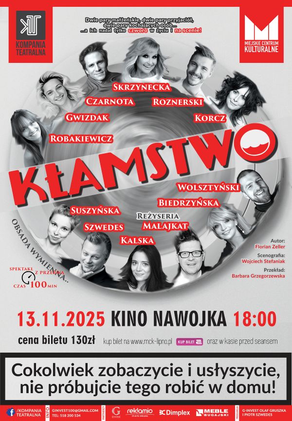 Dwie pary małżeńskie, dwie pary przyjaciół, dwie pary kochanków, a ich nadal tylko czworo, jak to jest możliwe ?. Wszystkiego dowiecie się Państwo podczas spektaklu „Kłamstwo”! Metaforycznie udało się w spektaklu połączyć Bergmanowskie „Sceny z życia małżeńskiego” z kilkoma komediami Woody`ego Allena. Oczywiście sztuka nie jest jeydnie słowną ekwilibrystyką, zawiera również racjonalny, ale i filozoficzny podtekst. Reżyser spektaklu, Wojciech Malajkat, niedawno powiedział: „Długo pracowaliśmy nad obsadą, ta sztuka wymaga nieprzypadkowych i wyśmienitych aktorów, którzy potrafią wydobyć niuanse zawarte w tekście, z wdziękiem rozbawić publiczność i sprawić, że paradoksalnie, kłamstwo ich czegoś nauczy. „