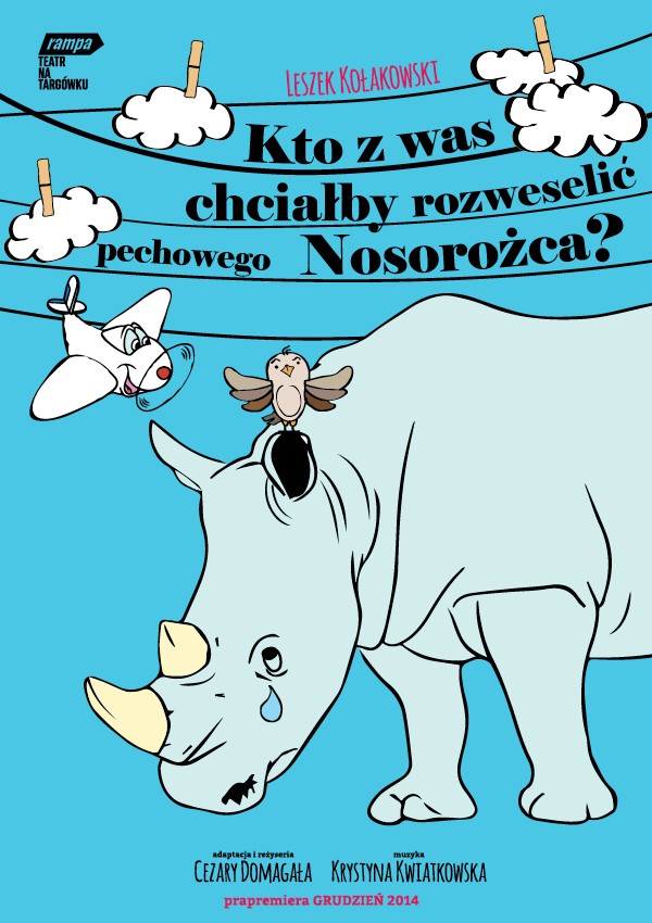 Tytułowy nosorożec ma pecha. Jest od dawna przybity faktem, że nie potrafi… latać. Tak bardzo chciałby być kimś innym, niż jest. Jego dobry znajomy wróbel pokazuje mu różne przedziwne sposoby na spełnienie niedorzecznego pragnienia. Czy jednak słusznie podtrzymuje jego złudne nadzieje i dlaczego nosorożec ślepo wierzy w to, co niemożliwe? Czy dokonując określonych wyborów powinien kierować się rozsądkiem czy marzeniem? Czemu nie potrafi zaakceptować siebie takim jakim jest? Czy problemy nosorożca nie są przypadkiem nam znane? Odpowiedź na te pytania, zarówno dzieci jak i dorośli znajdą w tym spektaklu. Gra aktorów oraz dowcipne piosenki wprowadzają nastrój radosnej zabawy, do której niewątpliwie zostaną wciągnięci mali widzowie.
