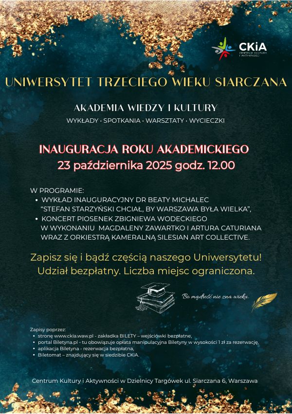 Uniwersytet Trzeciego Wieku Siarczana – Akademia Wiedzy i Kultury, działający przy Centrum Kultury i Aktywności w sercu Targówka Fabrycznego, to przestrzeń, w której doświadczenie spotyka pasję, a dojrzałość wieku staje się inspiracją do nieustannego rozwoju.