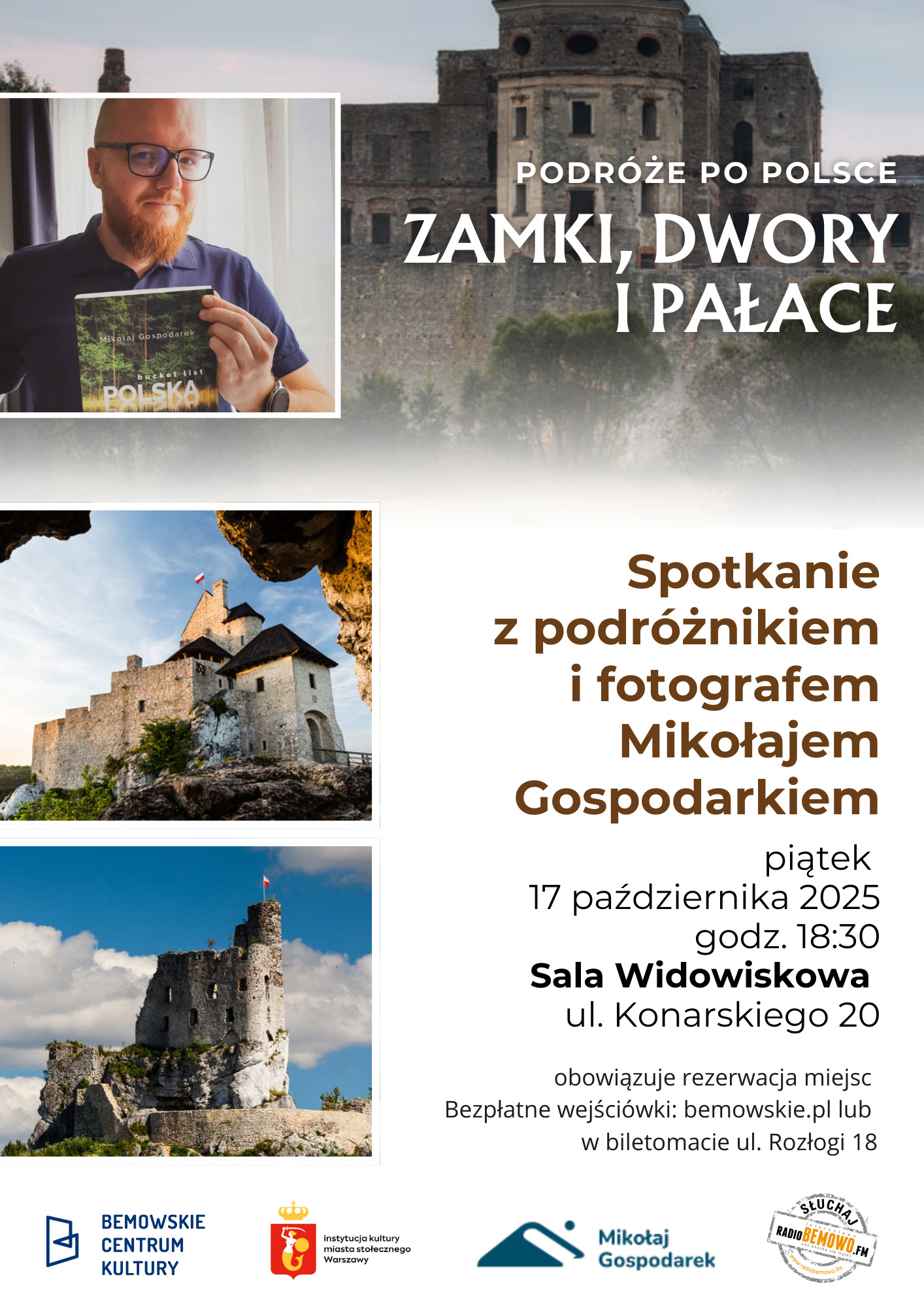 Zapraszamy na niezwykłe spotkanie z podróżnikiem i fotografem Mikołajem Gospodarkiem, który zabierze nas w magiczną podróż po najpiękniejszych polskich zamkach, dworach i pałacach. W czasie wieczoru usłyszymy pasjonujące opowieści, zobaczymy zapierające dech w piersiach fotografie oraz poznamy tajemnice historycznych miejsc, które od wieków kryją swoje sekrety.