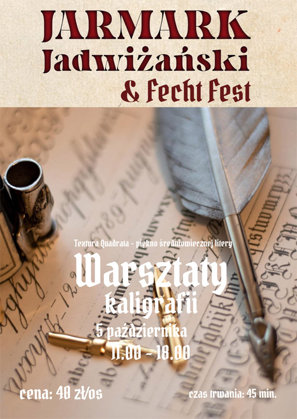 Ścięte narzędzia maczane w atramencie, sunące rytmicznie po papierze, gdy w skupieniu kreślimy kształt za kształtem, tworząc charakterystyczne dla złotej ery średniowiecza kształty. Tak będzie wyglądać warsztat, podczas którego wykreślimy hasło "Jarmark Jadwiżański", a wcześniej zagłębimy się w technikę kaligrafii średniowiecznej. Na warsztatach nie zabraknie ciekawych atramentów i papierów, aby zapoznać się z szerokim wachlarzem współczesnych możliwości rynku piśmiennego. Warsztaty poprowadzi Zuzanna Chróścik "Scriptfolium", kaligrafka i historyczka sztuki, prowadząca od 6 lat autorską pracownię kaligrafii we Wrocławiu.