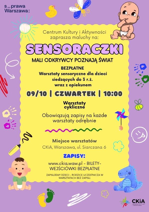Centrum Kultury i Aktywności zaprasza dzieci siedzące do 3. roku życia wraz z opiekunami na BEZPŁATNE warsztaty sensoryczne.