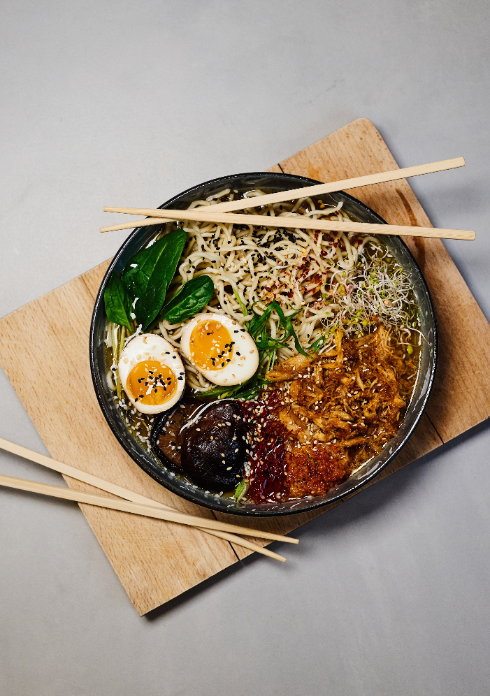 Ramen doprawimy tare na bazie sosów sojowych. Podamy z olejem z palonego czosnku i mlekiem sojowym. Dodatki to oczywiście grzyby, kiełki fasoli mung, zioła i prażona cebulka.