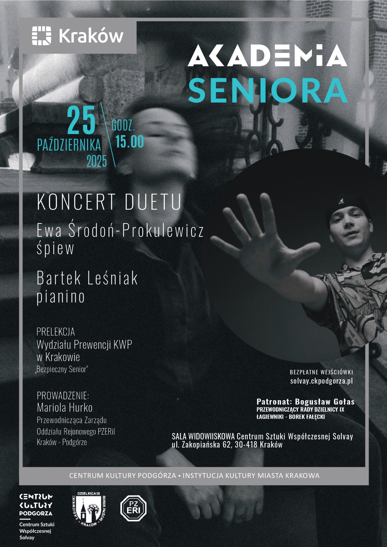 W październiku przygotowaliśmy dla Państwa prelekcję "Bezpieczny senior", którą poprowadzi Funkcjonariusz Wydziału Prewencyjnego Komendy Wojewódzkiej Policji w Krakowie oraz koncert Jazzowego Duetu Ewy Środoń-Prokulewicz i Bartka Leśniaka.