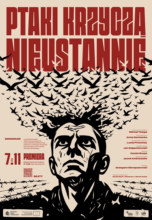 Projekt „Ptaki krzyczą nieustannie – premiera monodramu” został dofinansowany ze środków Unii Europejskiej w ramach Krajowego Planu Odbudowy oraz ze środków budżetu Miasta Ełku.