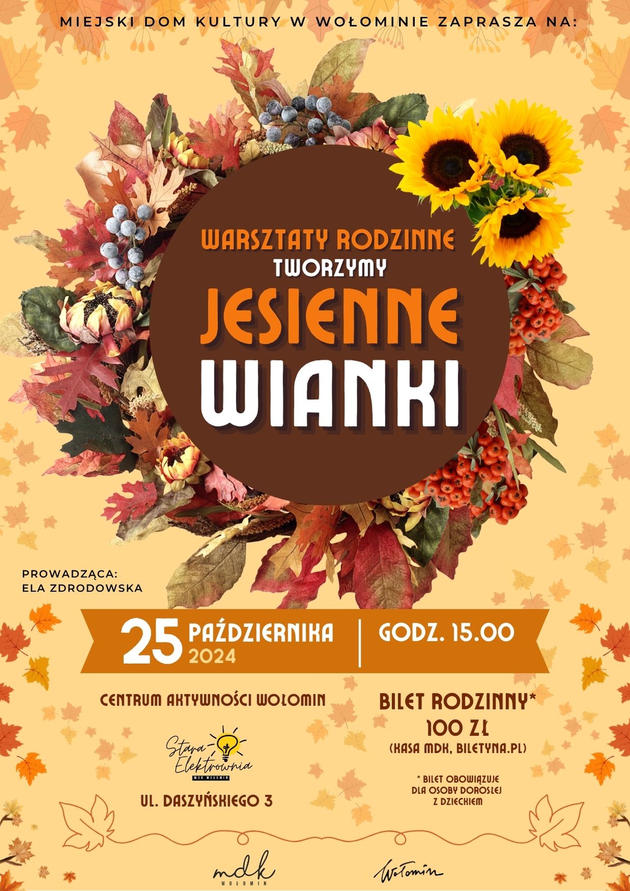 Miejski Dom Kultury w Wołominie zaprasza serdecznie dzieci razem z opiekunami na kreatywne warsztaty rodzinne pn. "Tworzymy jesienne wianki", które odbędą się w sobotnie popołudnie, 25 października 2025 roku od godziny 15:00 w Centrum Aktywności Wołomin -Stara Elektrownia przy ul. Daszyńskiego 3 w Wołominie.