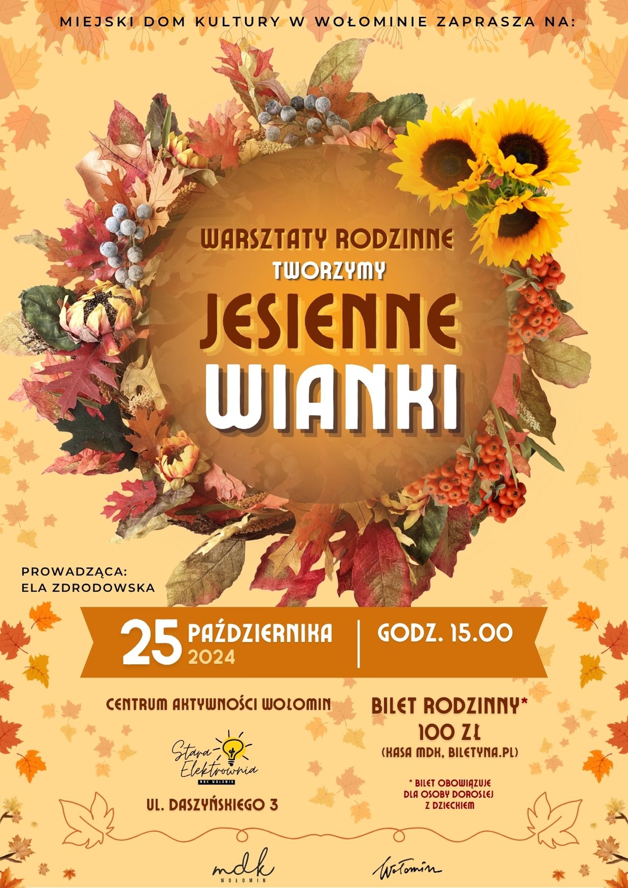 Miejski Dom Kultury w Wołominie zaprasza serdecznie dzieci razem z opiekunami na kreatywne warsztaty rodzinne pn. "Tworzymy jesienne wianki", które odbędą się w sobotnie popołudnie, 25 października 2025 roku od godziny 15:00 w Centrum Aktywności Wołomin -Stara Elektrownia przy ul. Daszyńskiego 3 w Wołominie.