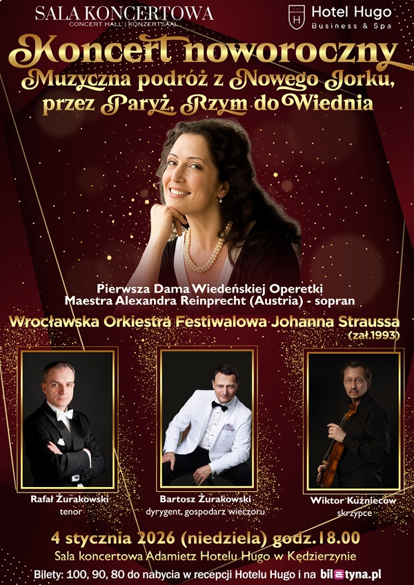 Solistką wieczoru będzie pierwsza dama wiedeńskiej operetki, maestra Alexandra Reinprecht z Austrii, a także polski tenor Rafał Żurakowski, skrzypek Wiktor Kuźniecow i wyborna Wrocławska Orkiestra Festiwalowa Johanna Straussa pod batutą maestro Bartosza Żurakowskiego, który wproawdzi Państwa w meandry światowej muzyki.
