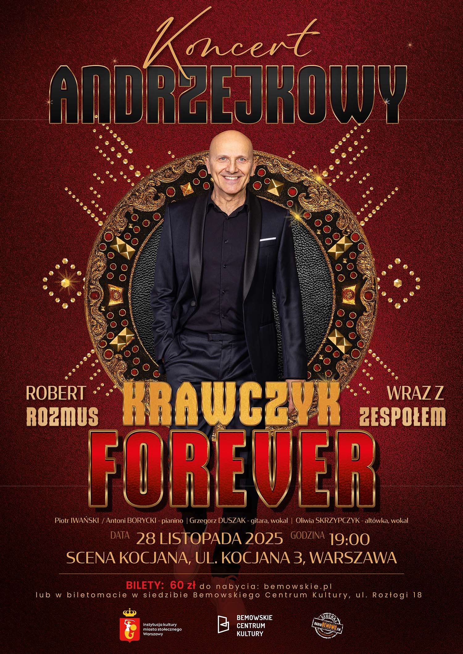 Zapraszamy na wyjątkowy Koncert Andrzejkowy „Krawczyk Forever” – muzyczną podróż przez największe hity legendarnego Krzysztofa Krawczyka w wykonaniu charyzmatycznego artysty Roberta Rozmusa, któremu towarzyszyć będzie zespół znakomitych muzyków: Oliwia Skrzypczyk – altówka, wokal; Piotr Iwański – pianino; Grzegorz Duszak – gitara.