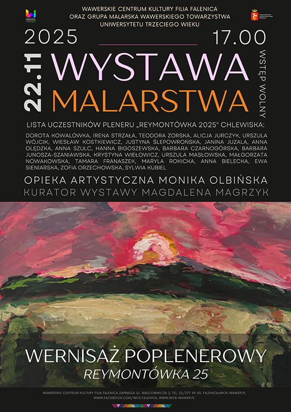 Zapraszamy na wernisaż wystawy malarstwa grupy malarskiej Wawerskiego Towarzystwa Uniwersytetu III wieku, Wernisaż poplenerowy - "Reymontówka 25" Chlewiska.