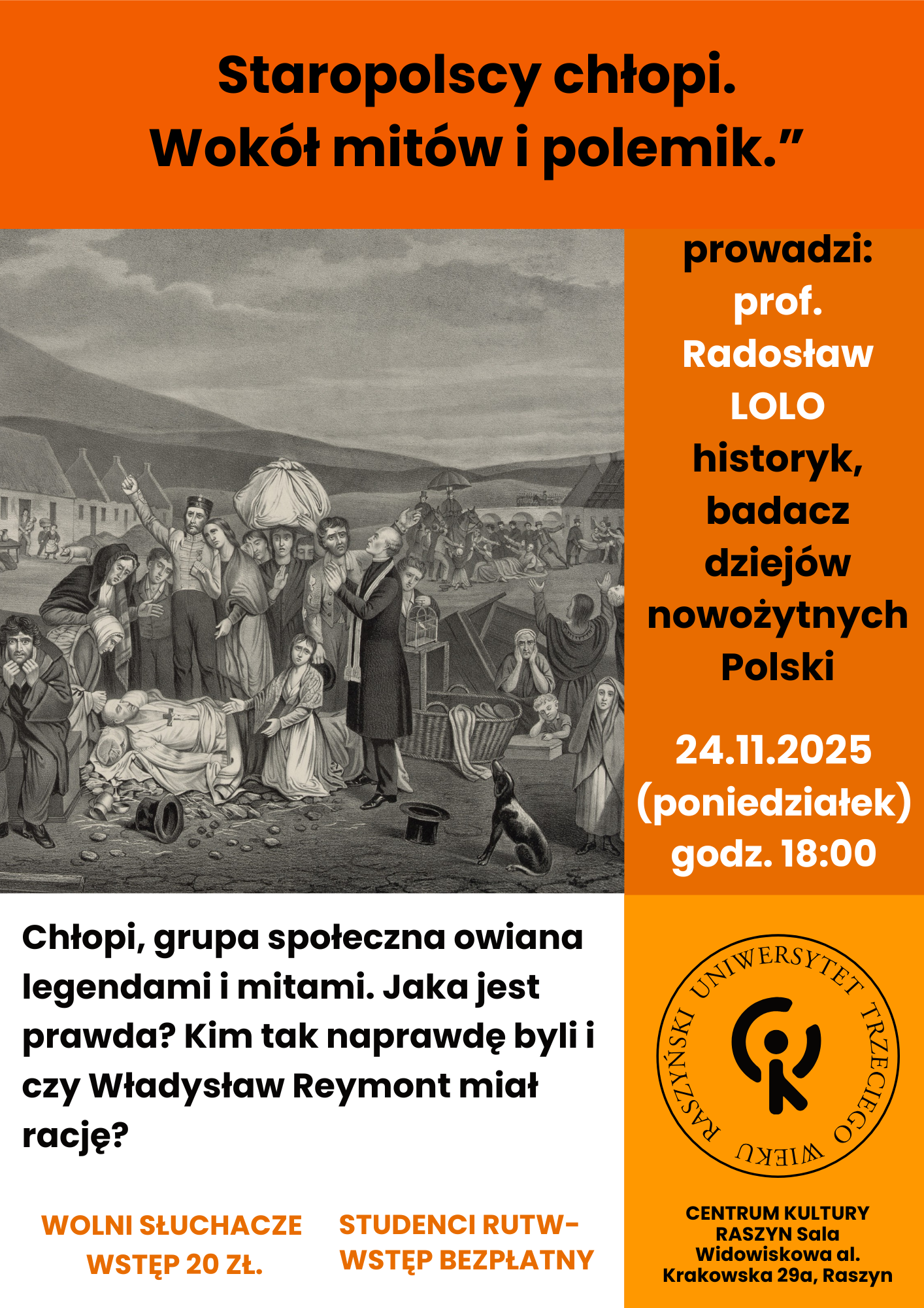 WYKŁAD RUTW: WYKŁAD HISTORYCZNY, temat: „Staropolscy chłopi. Wokół mitów i polemik.” Prowadzi prof. Radosław LOLO z Akademii Finansów i Biznesu VISTULA,